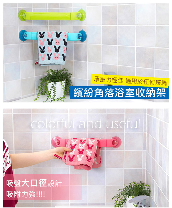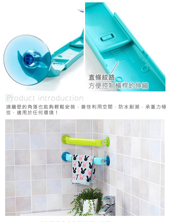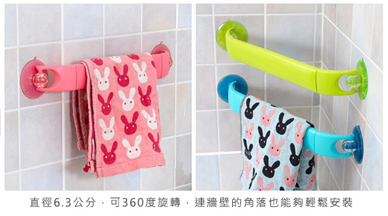 吸盤可旋轉,吸力強,光滑平面、牆角都可使用,可伸縮式掛杆設計,使得家裡一般的毛巾都能掛,很方便。