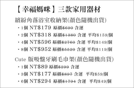 商品訊息簡述: 只要89元起(含運)即可購得原價最高5520元浴室收納架系列:(A)繽紛角落浴室收納架(顏色隨機出貨)1個/2個/4個/8個/(B)Cute版吸盤牙刷毛巾架(款式顏色隨機出貨)1個/3個/6個。